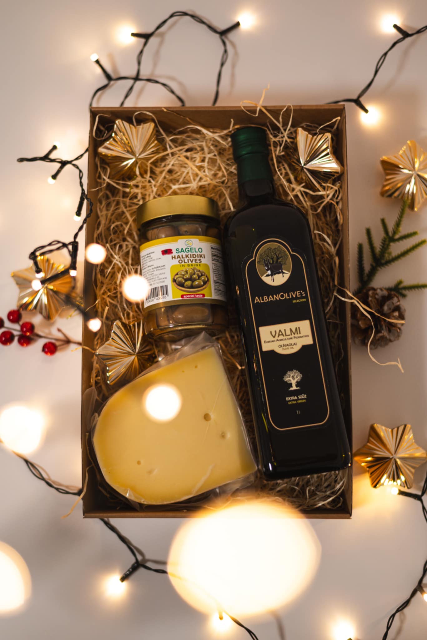 Tartalma: 1 liter AlbanOlive VALMI Frantoio vagy Koroneiki extra szűz olívaolaj, 2 üveg választott olívabogyó (választható: Berati magozott olívabogyó 170-180gr gr, vagy Berati magozott olívabogyópaprikával töltve 200 gr, Berati Roppantott olívabogyó 200 gr, vagy Halkidiki olívabogyó 200 gr, vagy Kalamon olívabogyó 200gr), kb 20 dkg Baracsai Félkemény gouda jellegű sajt  a Csíz Sajtműhely választékából.